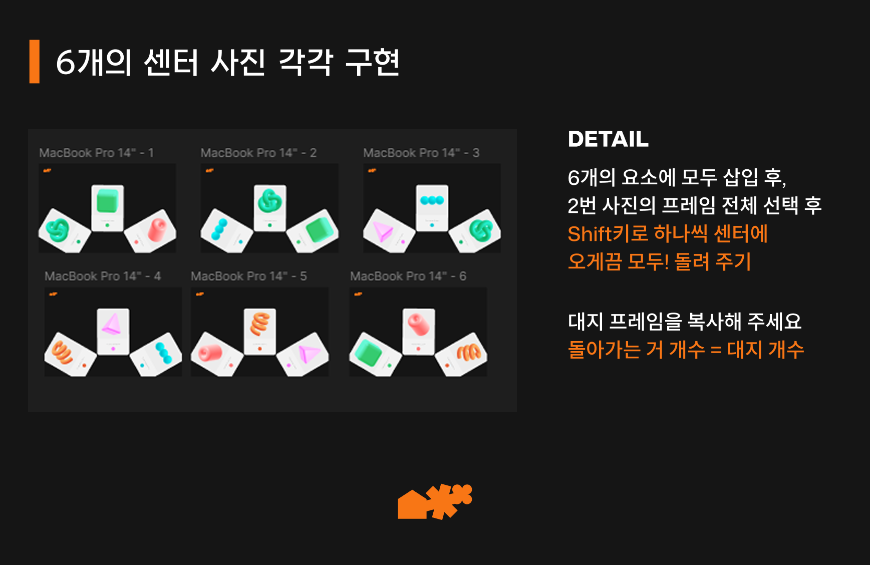 이렇게 요소를 배치하고 나면, 사진을 넣을 때 모든 요소들에 박힌 사진이 센터에 와 있는 대지들을 구경하실 수 있습니다